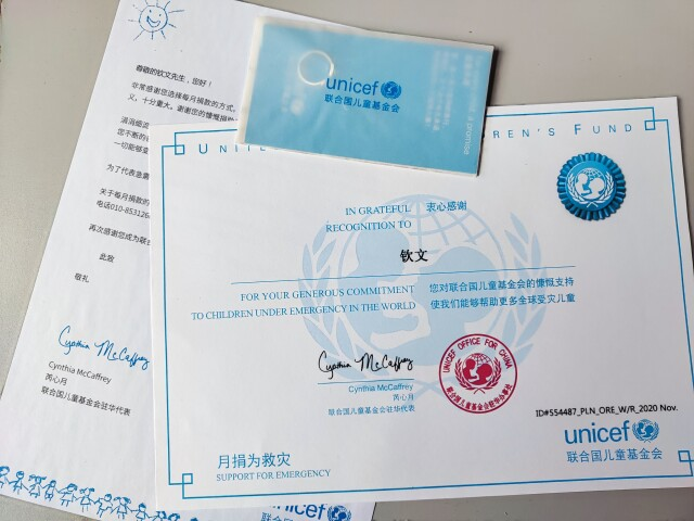 2021114日,一封來自聯合國兒童基金會(UNICEF)駐華代表處的快遞寄到欽文手中,里面有一枚戒指和一封聯合國兒童基金會駐華代表親筆簽名的感謝信。欽文說,這是最好的禮物。一定要將這件事堅持做下去。