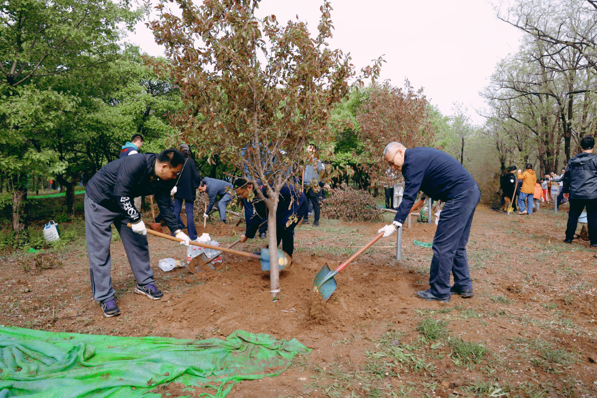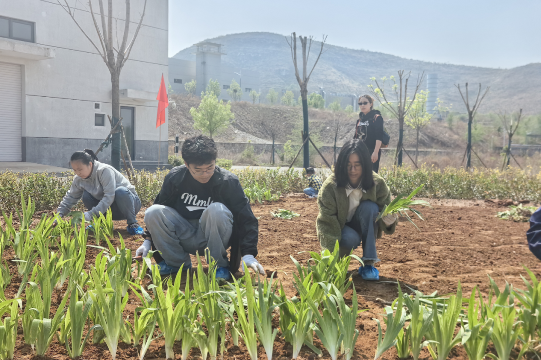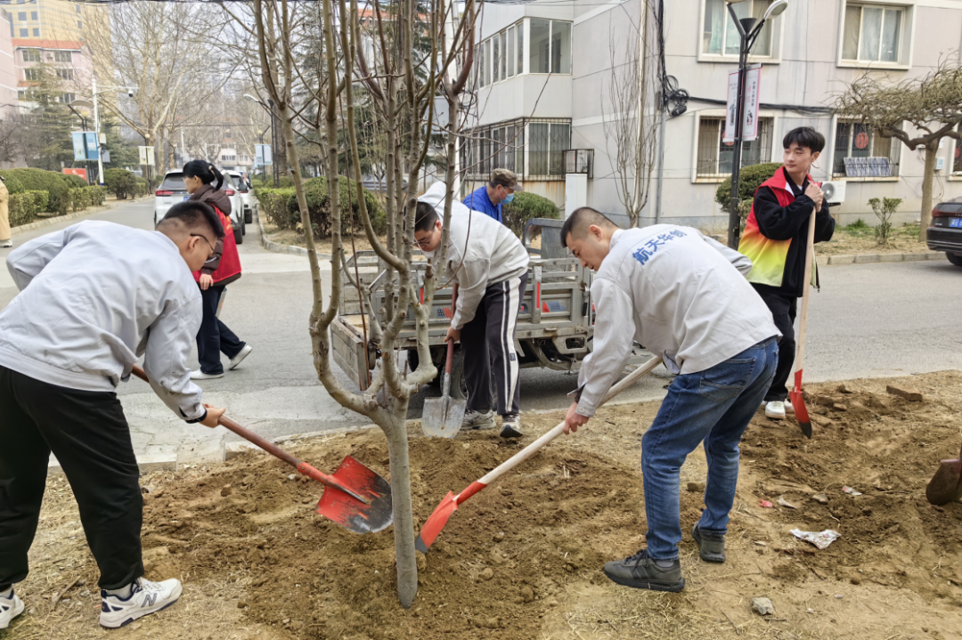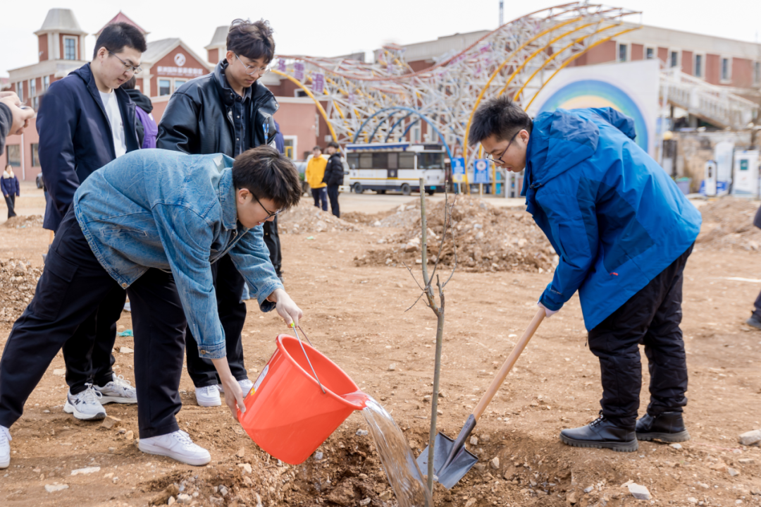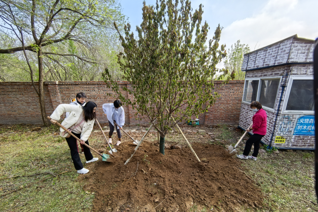 植樹現場,春和景明,一片繁忙有序的勞動景象。大家分工協作,默契配合,揮鍬鏟土、培土圍堰、提桶澆水,種下海棠、山楂、牡丹等樹苗。在和煦的春風中,一株株樹苗錯落有致地挺立著,展現出勃勃生機。